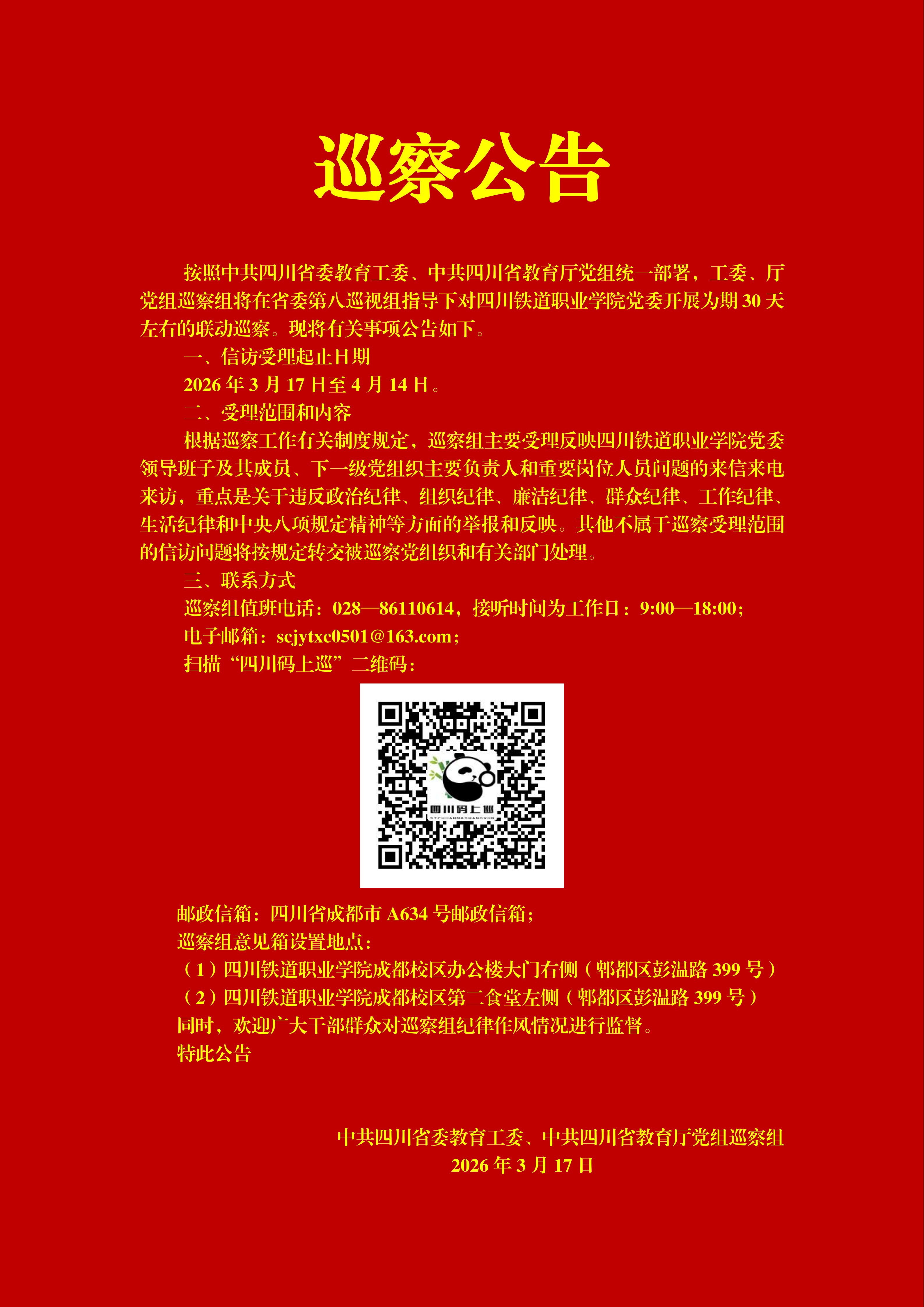四川铁道职业学院办学突出问题举报电话:028-68939939,邮箱为:1724117598@qq.com