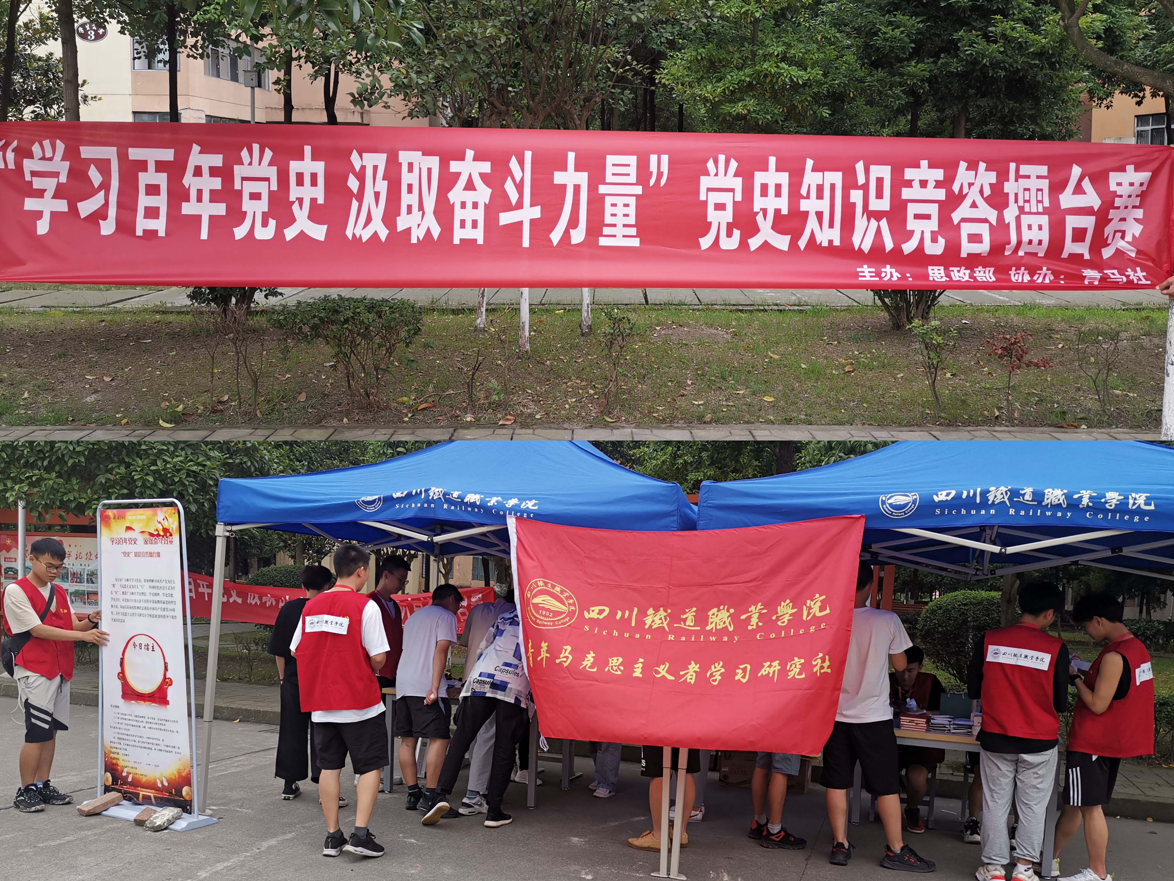 根据《四川铁道职业学院党史学习教育实施方案》(川铁职院委〔2021〕8号)安排,2021年6月16日——6月17日,由思政部主办、青年马克思主义者学习研究社(以下简称“青马社”)承办,面向全校师生开展了主题为“学习百年党史 汲取奋斗力量”的党史知识竞答擂台赛。