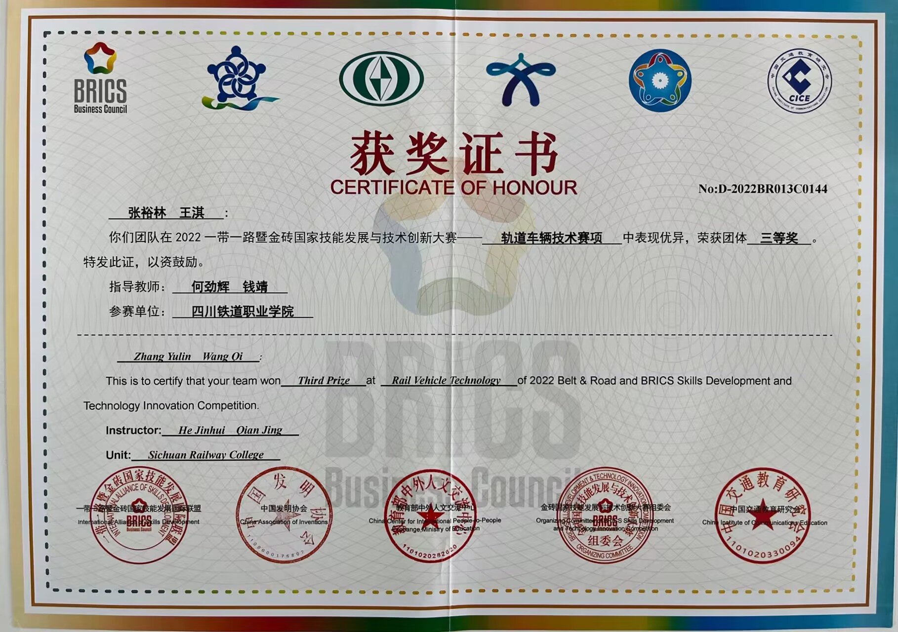 城市轨道交通学院参加2022年一带一路暨金砖国家技能发展与技术创新大赛之轨道车辆技术赛项,学院王淇、张裕林两位同学在国内比赛中获得全国三等奖,实现了我校在该项比赛中的突破。