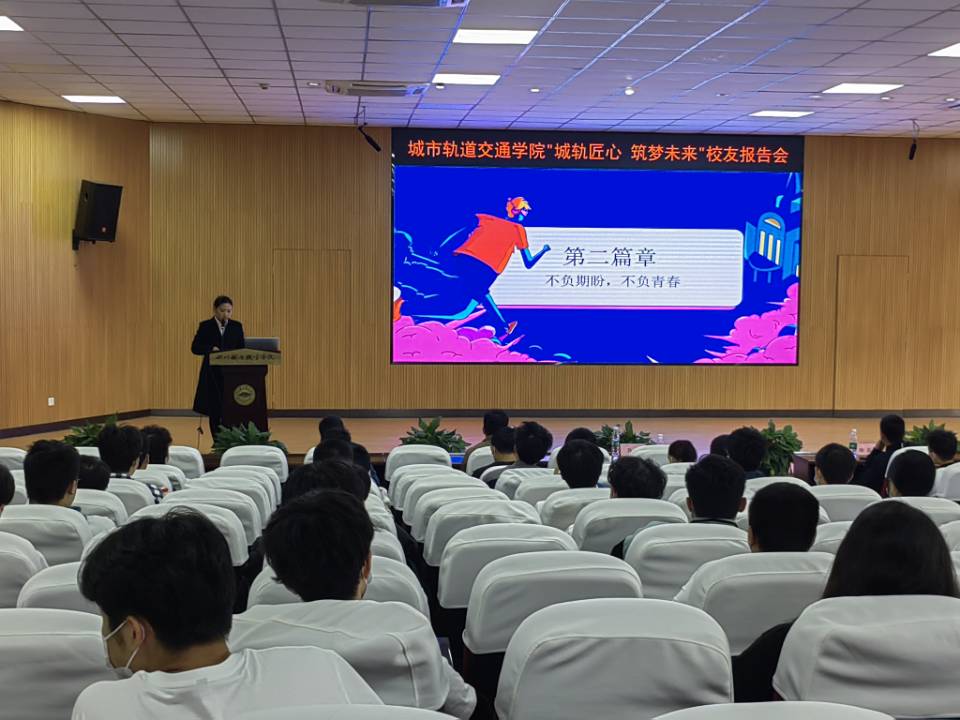 韶光流转,盛事如约。2022年11月8日,即学校建校70周年校庆周的第二天,城市轨道交通学院开展了“奋进七秩谱华章 芳华与共新征程”系列活动。 一、“城轨匠心 筑梦未来”校友报告会 当日上午9时,城市轨道交通学院在学校学术报告厅举办“城轨匠心 筑梦未来”专题校友报告会。2006级校友、成都地铁运营三公司9号线运营中心副主任兰平健,2006级校友、成都地铁控制中心副主任徐磊,2009级校友、成都地铁4号线电客车组长肖芳,2009级校友、成都地铁运营四公司安全管理王荣作为本次校友报告会的嘉宾分别做了报告,与师生们共同分享。