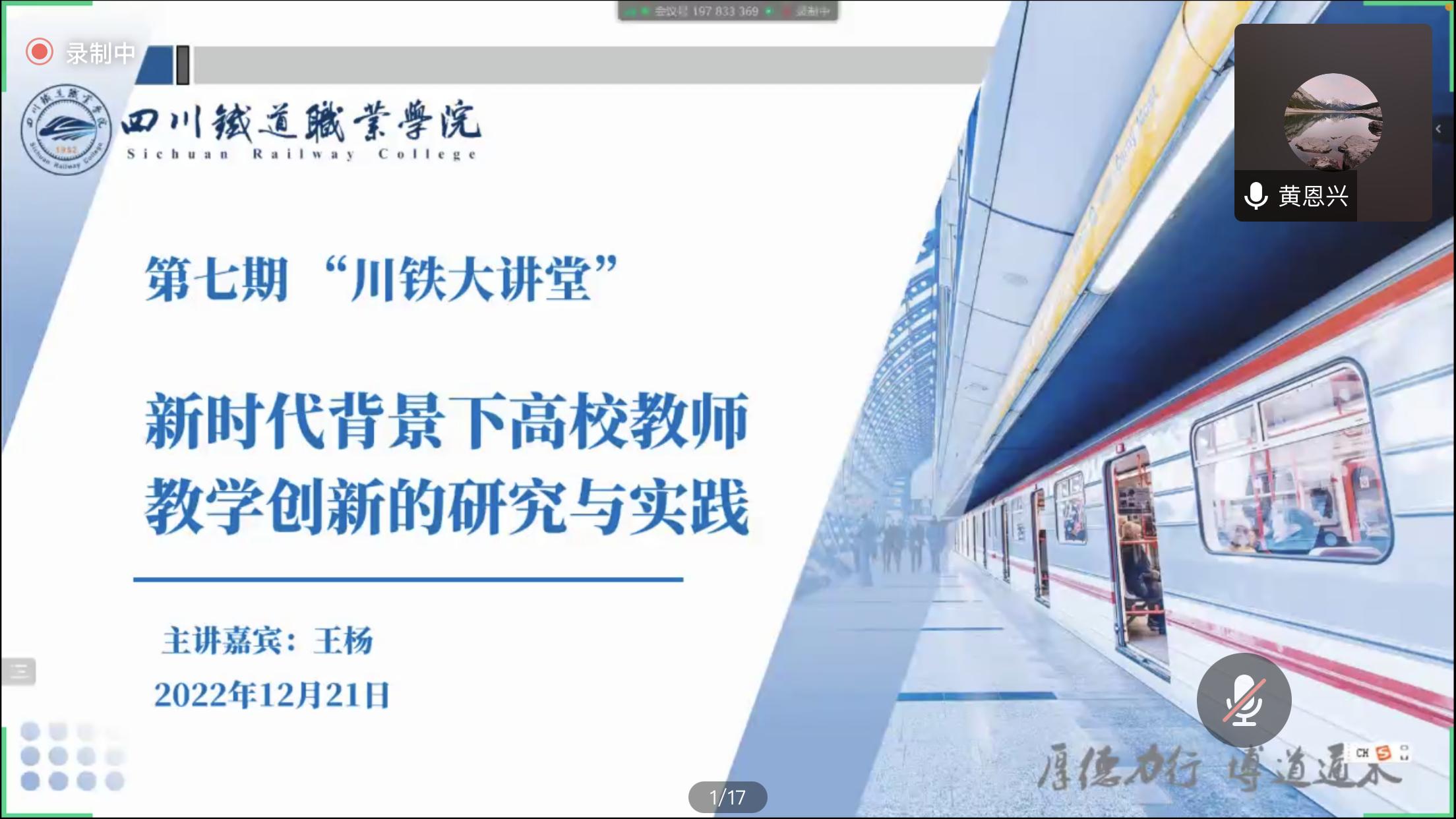 12月21日,四川铁道职业学院成功举办第七期“川铁大讲堂”,主题为“新时代背景下高校教师教学创新的研究与实践”。本期讲座由学校党委委员、副校长黄恩兴主持,采用腾讯会议线上直播形式,各二级学院院长及200余名教师参加了线上讲座。