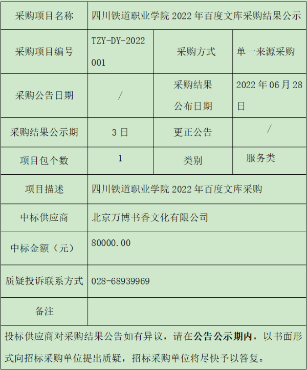 四川铁道职业学院2022年百度文库单一来源采购结果公示