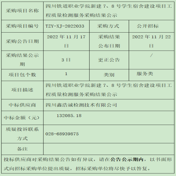 四川铁道职业学院新建7、8号学生宿舍建设项目工程质量检测服务采购结果公示