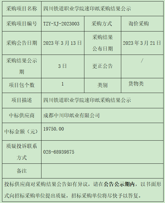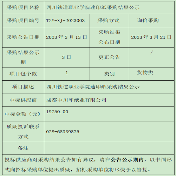 四川铁道职业学院速印纸采购结果公示