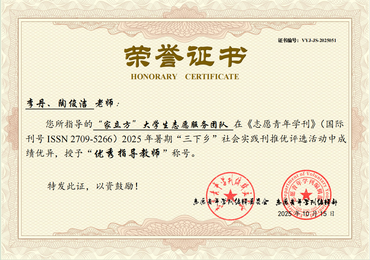 近日,经济管理学院“家立方”大学生志愿服务团队撰写的实践纪实作品《青春力量深耕社区,实践赋能基层治理》被《志愿青年学刊》(国际刊号ISSN 2709-5266)正式录用刊发。同时,在该刊物主办的2025年暑期“三下乡”社会实践刊推优评选中,该作品荣获“活动纪实类三等奖”。团队指导教师李丹、陶俊洁荣获“优秀指导教师”称号。 2025年7月,“家立方”团队深入成都市和新区红专村与火花村,开展了为期五天的“三下乡”社会实践活动。团队聚焦社区环境治理与基层共建,通过前期细致调研,发现社区公共区域存在垃圾堆积、设施维护不足等问题。基于专业背景,团队制定了“清、教、建”三位一体的治理方案,积极投身环境整治与社区教育,以实际行动践行新时代青年的责任与担当。 此次活动不仅提升了学生的社会实践能力和专业素养,也展现了铁职院学子服务基层、奉献社会的青春风采。团队负责人刘强及成员杭海龙、王梓霖等15名同学在教师指导下,将课堂所学转化为社区服务实效,探索出一条“专业+服务+治理”相结合的实践育人新路径。 学院将持续推动志愿服务与社会实践深度融合,鼓励更多青年学子走进社区、服务基层,在实践中成长,在奉献中成才,为推进基层治理现代化贡献青春力量。
