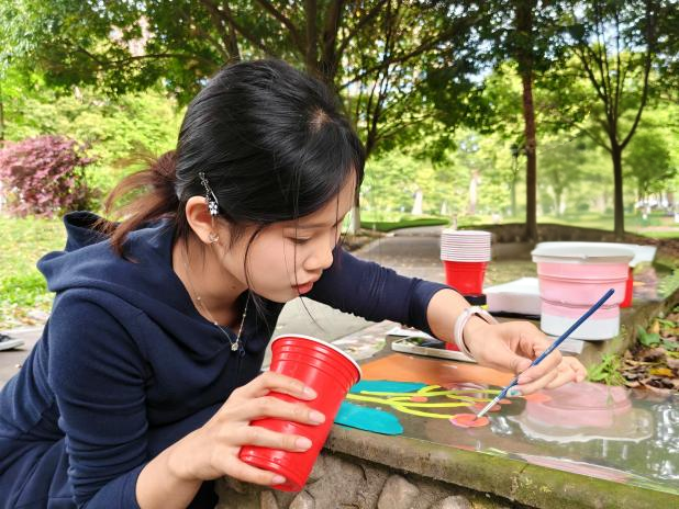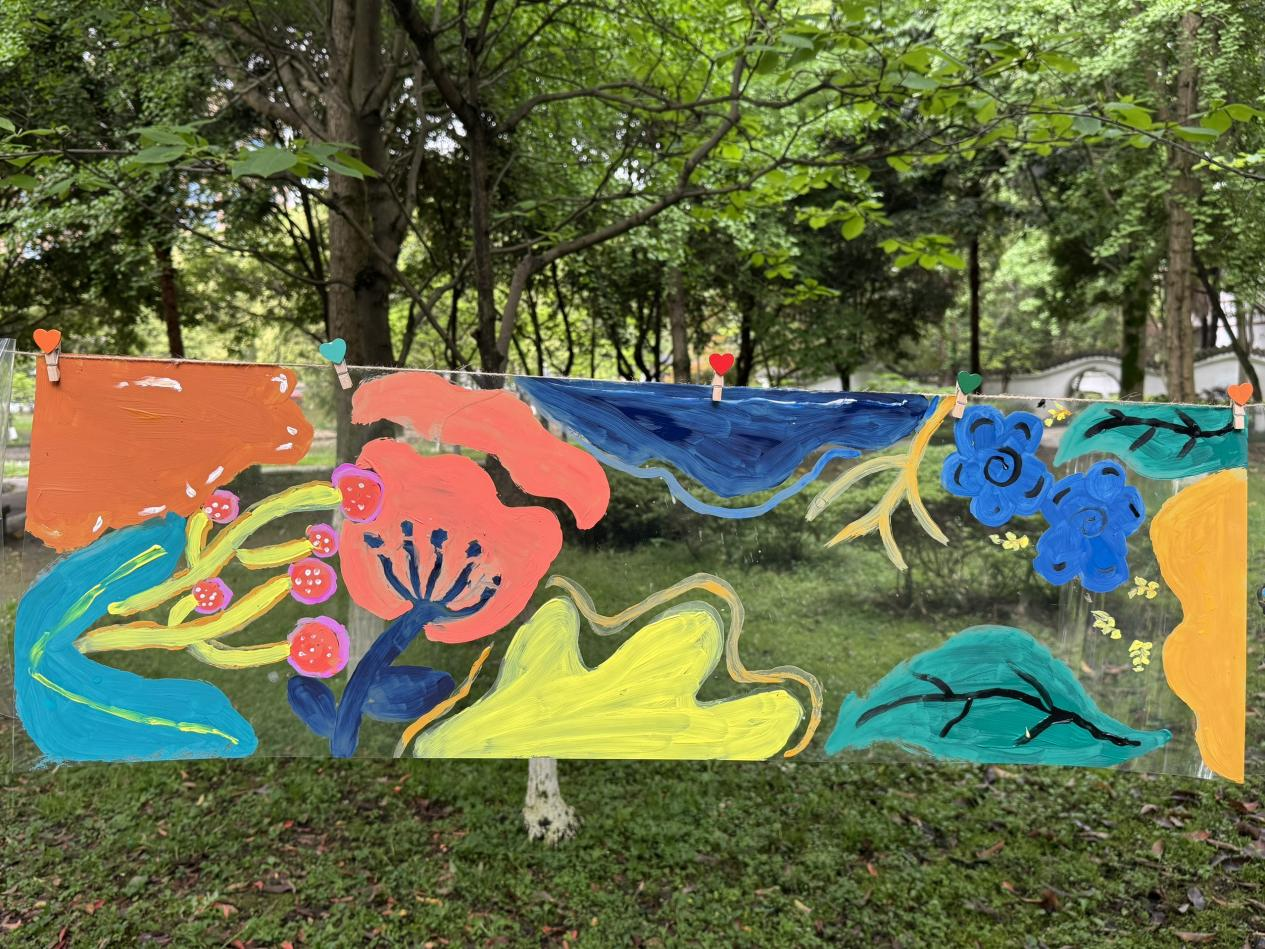 “新窗映彩,绘见美好”透明布丙烯绘画环节,林间悬挂的透明画布成为情绪载体,同学们用颜料自由勾勒春日景致与内心图景。阳光穿透画布,斑斓色彩与公园绿意相映成趣,绘画成为情绪宣泄与自我表达的通道,帮助大家在色彩中释放压力。