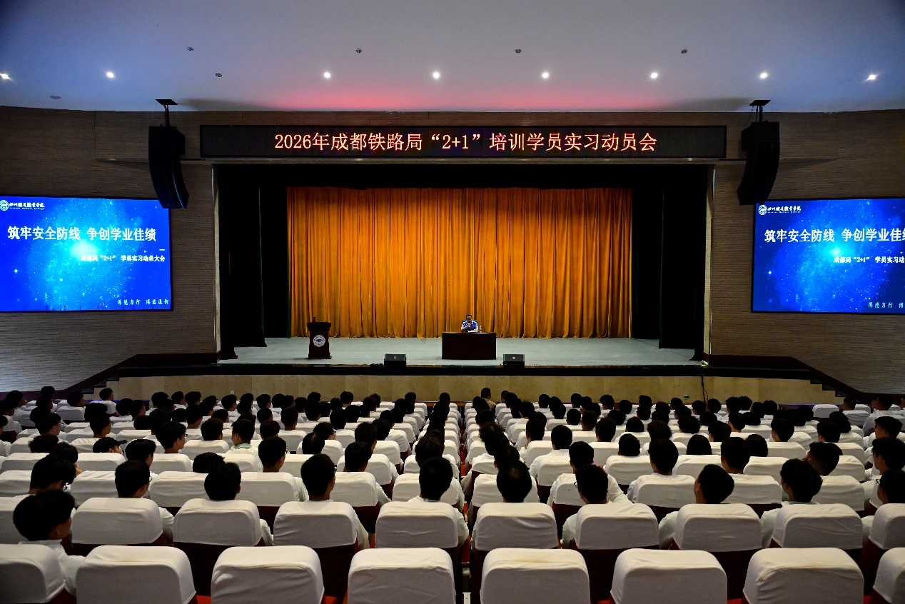 为切实帮助新入职学员顺利完成“2+1”培训,平稳实现从校园到职场的角色转变,4月15日,铁道工电学院在大礼堂召开2026届成都铁路局“2+1”培训学员动员会。来自全国各地的362名工务、供电方向学员参会,中国铁路成都局集团有限公司内江工务段团委书记温明富、学院党总支副书记、副院长董浩出席会议并讲话。 温明富作为学院2012届优秀校友,从14年铁路从业经验出发,为学员指引方向。他表示培训期间学员有任何疑问均可随时沟通,他将全力提供帮助、分享经验。同时嘱托学员:一坚守安全底线,严格遵守安全制度;二重视培训价值,认清其衔接校园与岗位的桥梁作用,扎实积累经验、提升技能。