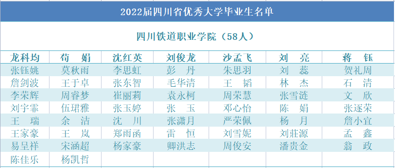 近日,四川省教育厅公布了2022届四川省优秀大学毕业生认定结果。经班级推荐、院系推荐、学校审核、教育厅复核,共计认定17611名大学生为2022届“四川省优秀大学毕业生”。其中,我校共有铁道交通运营管理19T1班王瑞等58名学生入选。