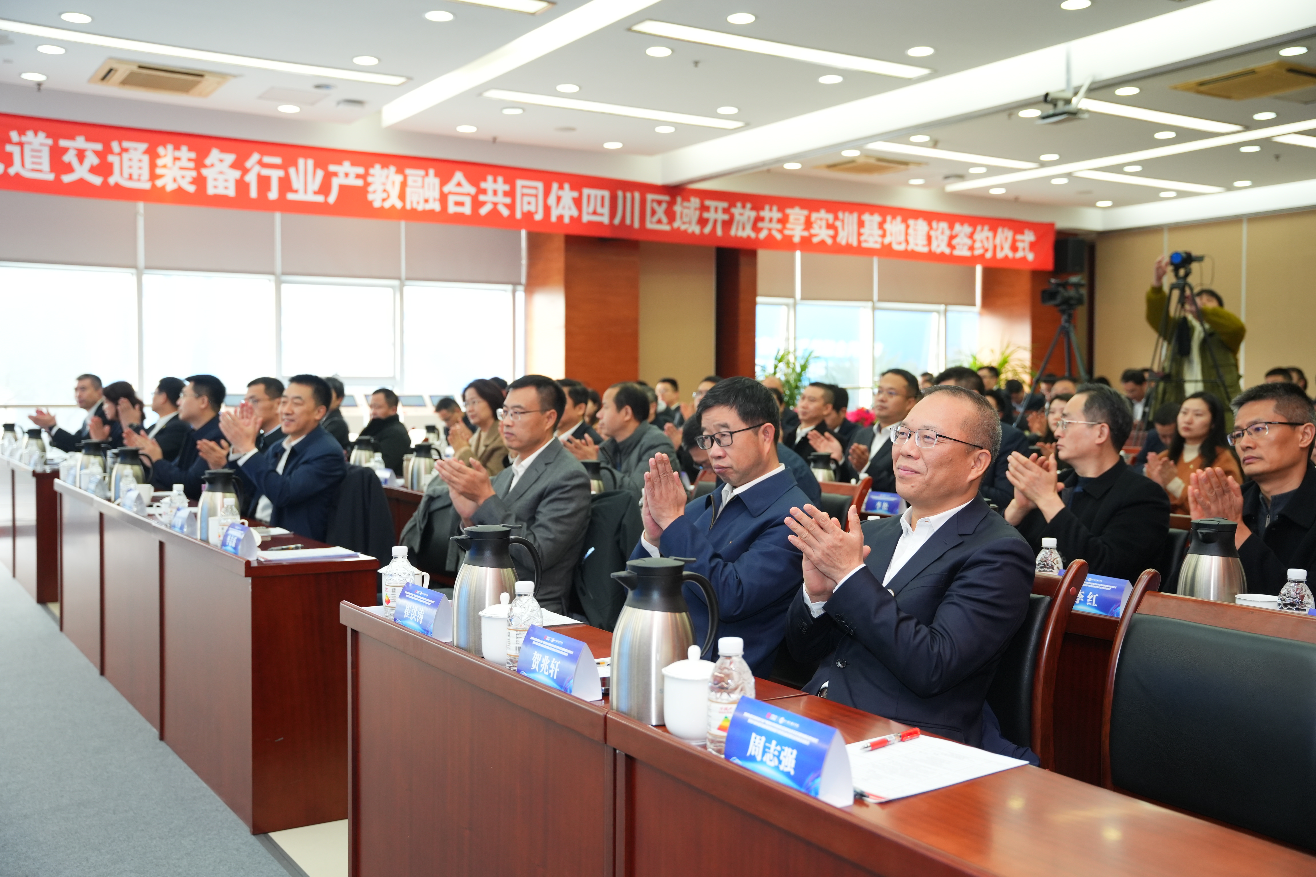 赖芳代表共同体成员单位作《挺膺担当 奋楫笃行 为共同体四川区域开放共享实训基地高质量建设而努力奋斗》主题报告。她表示,参与轨道交通装备行业产教融合共同体建设,是职业院校重大发展机遇,更是光荣使命。学校将以基地建设为突破口,坚持产教融合、产学合作,以“大实训”的思路和视野,与其他成员单位共同努力探索校企实训基地共商、共建、共享新模式,积极探索“卓越工程师——现场工程师——技能人才”完整的培养体系,致力于培养轨道交通“懂制造、精运用、强检修”的高技术技能人才。积极融入区域轨道交通企业高质量发展,努力建设四川区域开放共享实训基地,奋力打造国家首个产教融合共同体的四川样本,为共同体建设贡献更多职教力量。 成员单位进行签约 随后,西南交通大学、四川铁道职业学院、四川交通职业技术学院、中车成都机车车辆有限公司、中车眉山车辆有限公司、中车资阳机车有限公司、成都天马铁路轴承有限公司、成都今创轨道交通设备有限公司、成都中车电机有限公司等 9 家国家轨道交通装备行业产教融合共同体四川区域开放共享实训基地共建单位代表上台签约,标志着国家轨道交通装备行业产教融合共同体四川区域开放共享实训基地建设正式启动。 与会领导为四川省轨道交通装备制造与智慧运维改革试点项目剪彩 会上,国家轨道交通装备行业产教融合共同体四川区域开放共享实训基地9家共建成员单位代表进行签约,与会领导为四川省轨道交通装备智能制造与智慧运维产教融合改革试点项目的启动剪彩。 为共享基地企业导师颁发聘书 企业导师拜师仪式 签约仪式后,与会领导还为共享基地企业导师颁发聘书,举行现场工程师拜师仪式。 西南交通大学校长助理,峨眉校区党工委书记、管委会主任、共同体副秘书长宋新,中车长江运输设备集团有限公司党委副书记崔洪涛,四川省教育厅职业教育处、四川省经济和信息化厅宣传教育处、眉山市经济和信息化局、眉山市科学技术局、眉山市教育和体育局、眉山市总工会等单位相关负责同志参加会议。签约仪式由中车眉山车辆有限公司副总经理周志强主持。