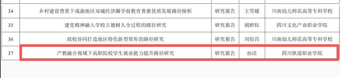 近日,四川高等职业教育研究中心公布了第四届职业教育研究优秀成果评奖结果。我校机车车辆学院教师孙活、张永昂主持的《产教融合视域下高职院校学生就业能力提升路径研究》研究成果,从众多优秀成果中脱颖而出,荣获四川高等职业教育研究中心第四届职业教育研究优秀成果奖三等奖。
