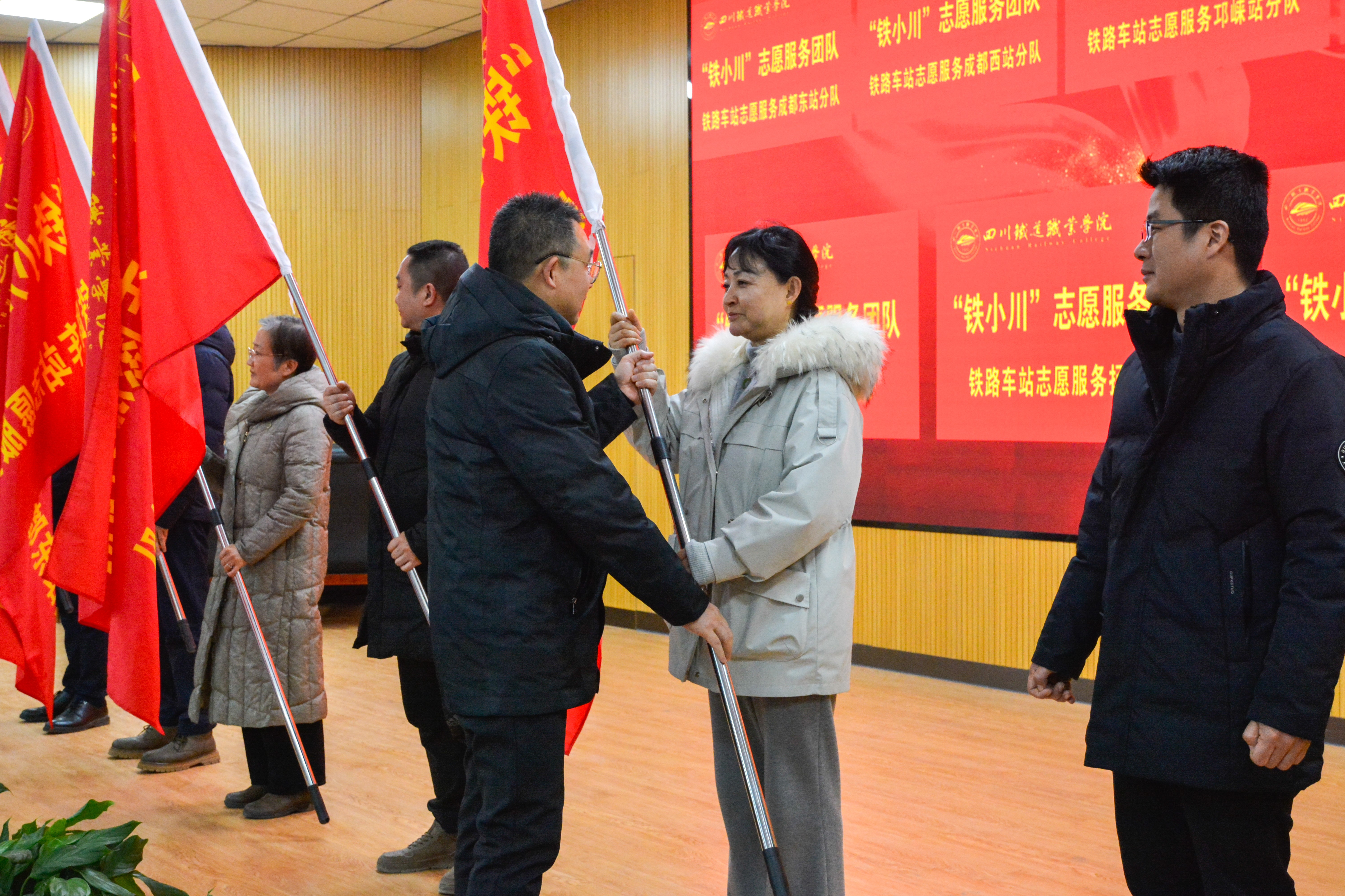 机车车辆学院辅导员谢冰阳作为指导教师代表发言,勉励志愿者服从铁路与学校双重管理,以“三心服务”展现川铁学子风采,在服务中实现知行合一,让“军人气质、大师素质”的育人理念在春运一线落地生根。铁道机车运用与维护24T7班学生代文杰号召全体志愿者以青春之名赴时代之约,用微笑温暖归途,用坚守守护平安,用奉献书写新时代青年的责任与荣光。 随后,代学灵为春运志愿服务队授旗,正式启动2026年春运志愿服务工作。志愿者代表杨欢带领全体队员庄严宣誓,承诺以最优状态、最高标准投入服务,擦亮川铁志愿品牌,贡献青春力量。