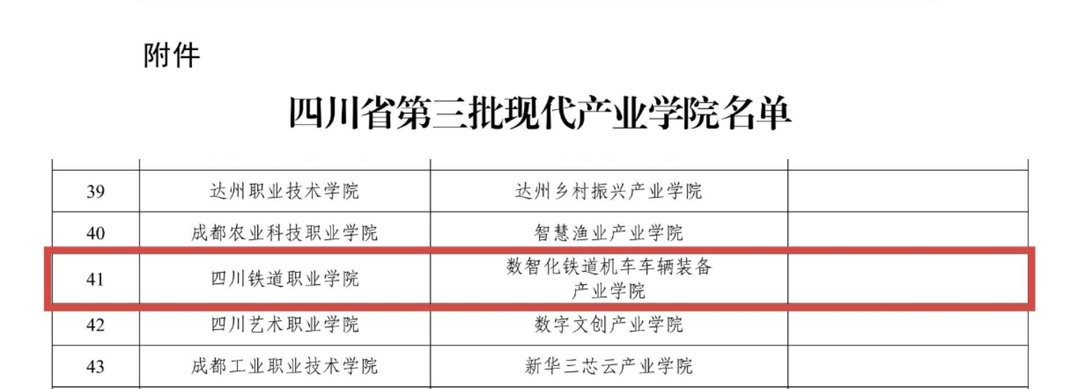 近日,四川省教育厅正式公布第三批省级现代产业学院建设名单,学校申报的“数智化铁道机车车辆装备产业学院”成功获批。这是我校首个省级现代产业学院,标志着学校在深化产教融合、服务轨道交通产业高质量发展方面取得重要突破。
