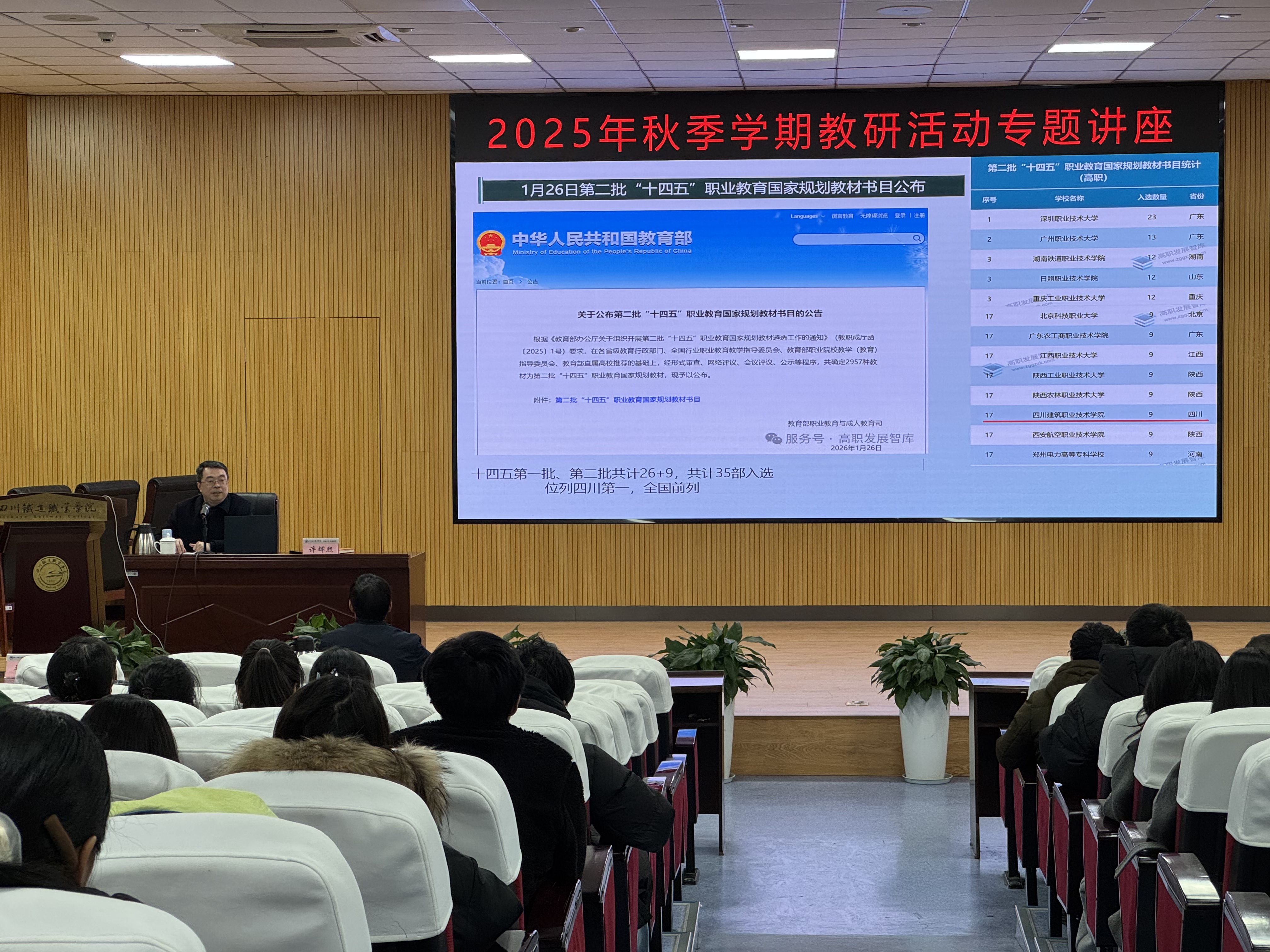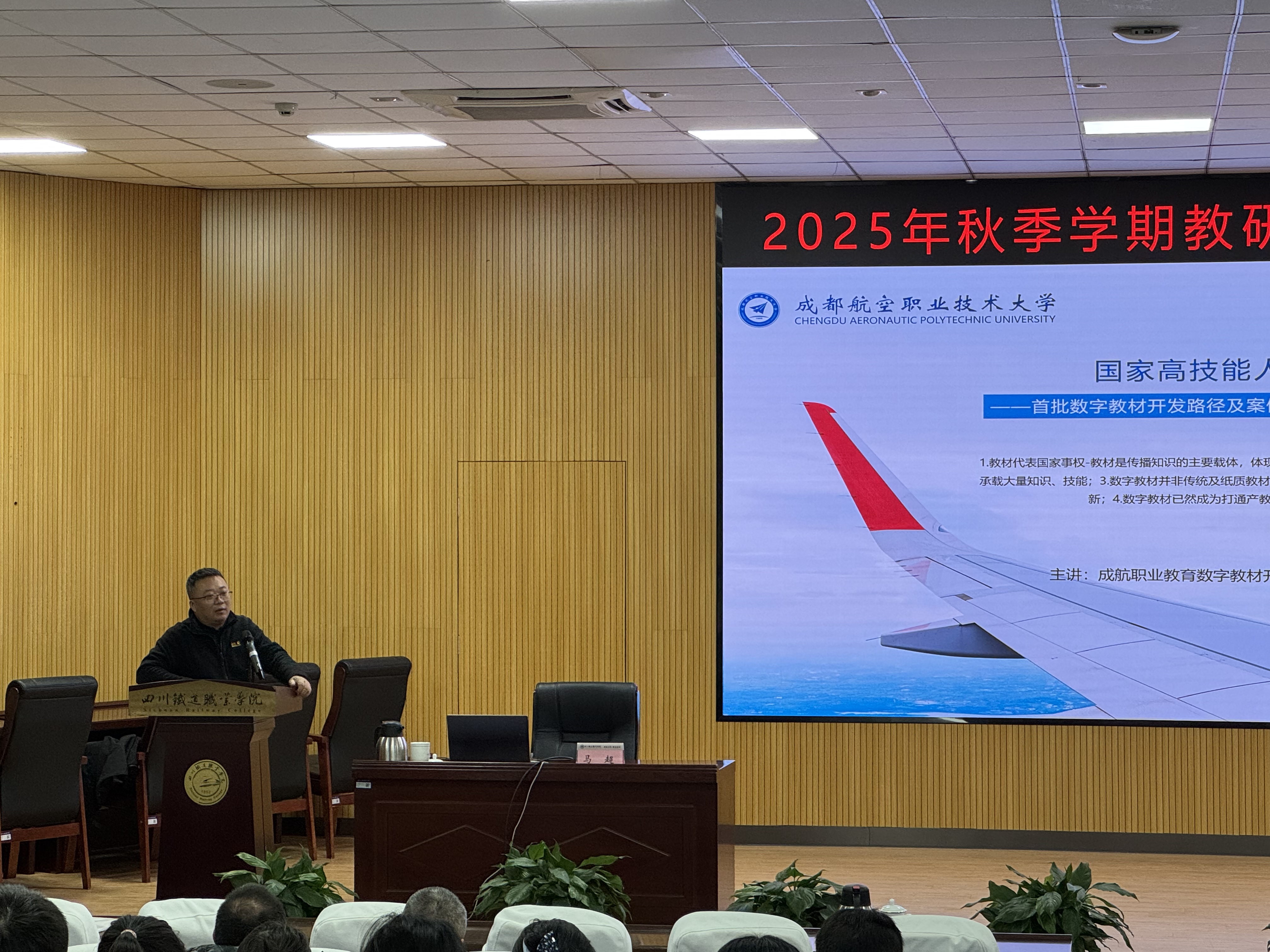专家高位引领,赋能教学高质量发展 1月29日,活动转入专题讲座环节,教务处特邀四位业内知名专家作深度指导。 四川建筑职业技术大学副校长、博士后许辉熙以“‘五金’建设”为抓手,系统介绍了该校在教材建设方面的特色举措与显著成效,深刻阐释了高质量教材在人才培养体系中的核心支撑作用;成都航空职业技术大学马超教授以《高技能人才集群培养计划的样板数字教材开发与实践——以大飞机数智化装配为例》为题,紧密结合产业前沿,生动呈现了数字教材从理念到落地的完整路径,提供了极具参考价值的行业范例;高等教育出版社李永主任聚焦“新双高”建设背景,深入解读国家政策导向,系统分析课程体系优化与教材创新面临的新形势、新任务,并提出切实可行的实施路径;高等教育出版社张妩熙则围绕“云创平台”的应用,详细讲解数字教学资源的内容创作工具、编写规范及典型应用场景,切实提升教师数字化教学资源开发能力。