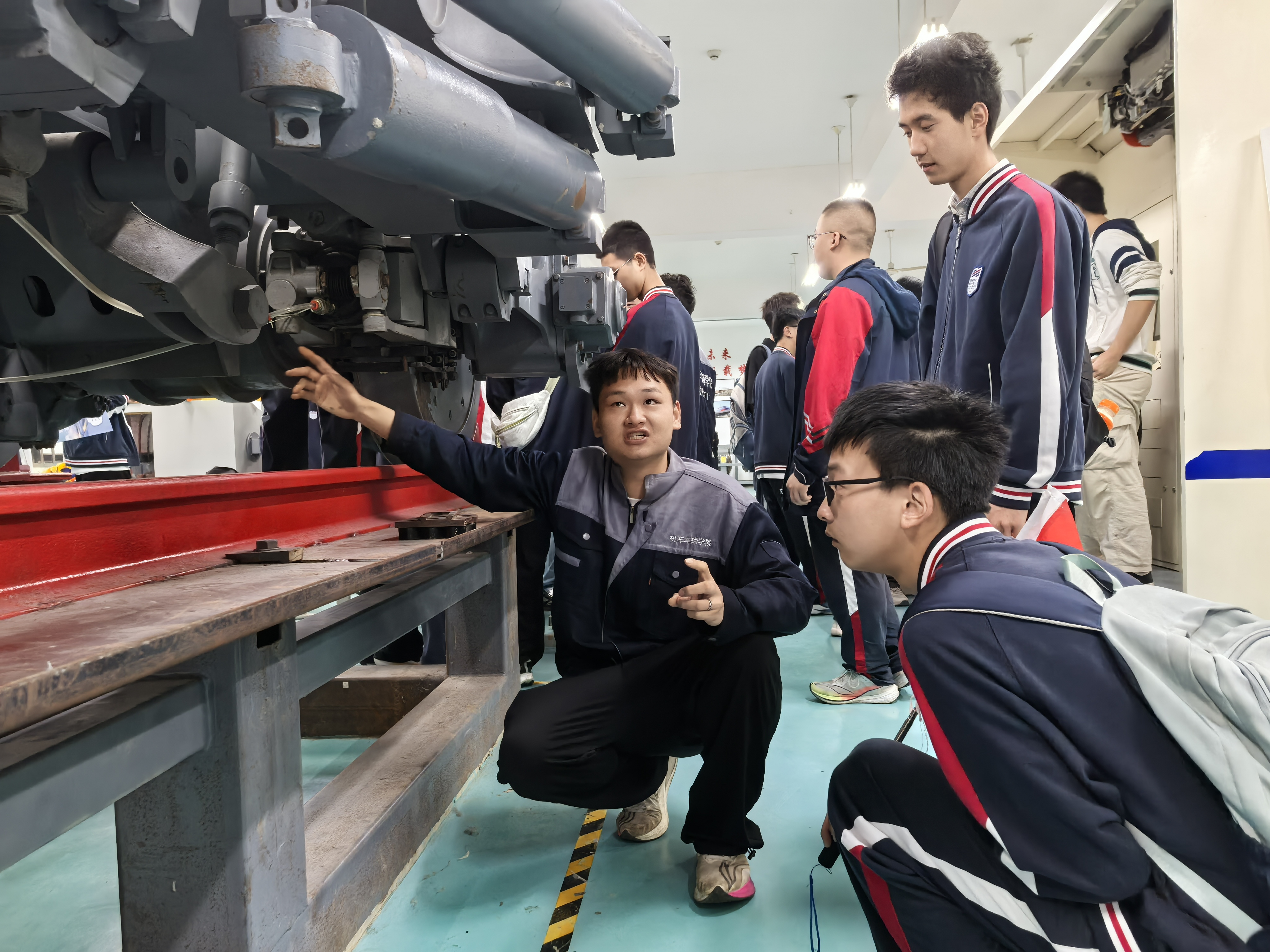 探秘高铁检修,致敬匠心守护 随后,师生步入高铁检修实训室。在志愿者讲解下,大家近距离观摩专业检修设备,了解高铁检修的职责与流程。从精密部件检测到故障排查,从规范操作到标准化作业,师生们深刻认识到,高铁的安全平稳,离不开检修人员日复一日的专业坚守与无私奉献。学子们表示,以往惊叹于高铁速度,如今更懂其背后的辛勤付出与责任担当。