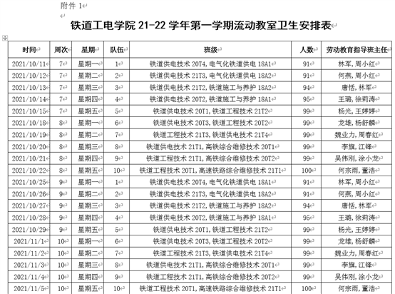 为全面贯彻党的教育方针,落实习近平总书记在全国教育大会上的讲话精神,加强大学生劳动教育,铁道工电学院结合学院实际,制定“铁道工电学院制定劳动教育实施方案”,为更好的进行劳动教育,我院制定了“铁道工电学院流动教室卫生管理办法”,于2021年10月11日起实施。
