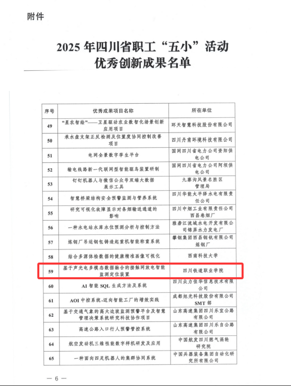 2025年12月25日,四川省总工会办公室发布通报,我校铁道工电学院教师何柏杉团队申报的《基于声光电多模态数据融合的接触网放电智能检测定位装置》项目,荣获2025年四川省职工“五小”活动优秀创新成果。该奖项充分肯定了我校职工在岗位创新中的突出贡献,展现了职工立足一线、以技术赋能产业升级的实践成果。
