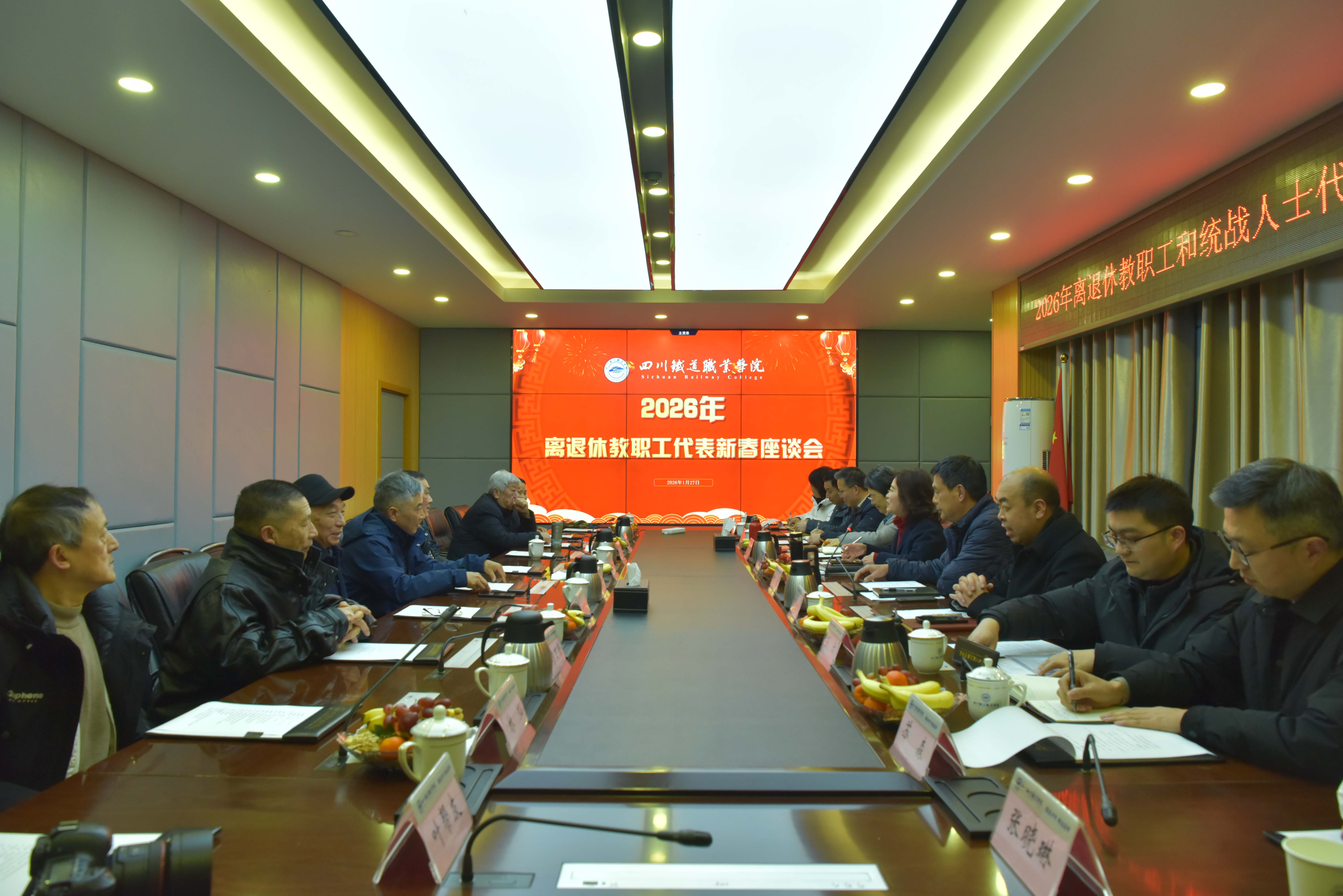 2026年1月27日上午,学校第五会议室暖意融融,气氛祥和。学校2026年离退休教职工代表新春座谈会在此隆重举行。校党委副书记、校长赖芳主持会议,与离退休老领导、老教师代表欢聚一堂,共迎新春,畅叙情谊,共话发展。党委副书记、工会主席黄勇,副校长王浩澂,党委委员、党委宣传统战部部长杨海涛等校领导及相关职能部门负责人参加了座谈。