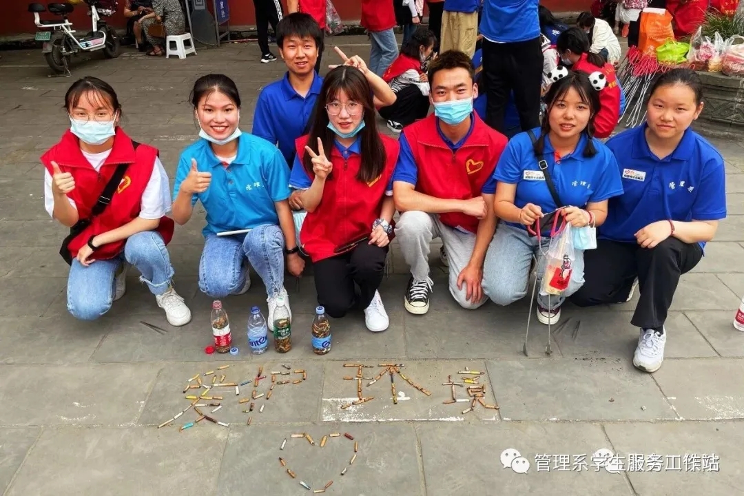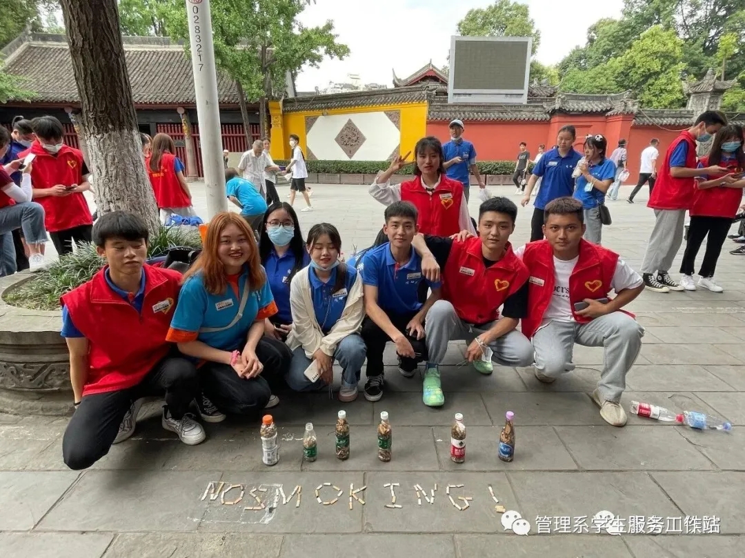 为提高我系学生环境保护意识,增进同学之间情感交流,了解我国红色历史文化。我系团总支在全系招募47名志愿者,于5月15日下午在青羊区文殊院开展了“爱成都,护环境,从我做起”的志愿服务活动。本次活动以文殊院为中心,要求所有志愿者清理文殊院社区周围区域的烟头、垃圾,并向周边游客宣传垃圾分类的相关知识,以培养青年勤劳、文明,爱环境的优秀品质,展现了当代青年思想的先进性、实践性。 本次活动在钟欣老师的带领下,分小组进行了时长两小时的环境清理活动。每个小组都在组长带领下认真进行环保工作,大家将空瓶子作为容器,用钳子和镊子捡拾地上的烟头和垃圾,大家在街道的每个角落仔细寻找,不偷闲、不懈怠。在活动结束后,各小组用收集的烟头进行了创意展示,并进行合照及录制相关视频,呼吁大家保护环境“爱成都、护环境、从我做起” 通过此次活动,促进了同学之间的交流,提高了团结协作能力,在体验团队合作乐趣的同时培养学生的创造能力,增强集体的凝聚力,大家也更充分体会到保护环境的重要性。