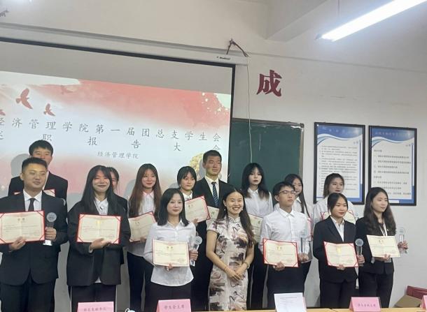 经济管理学院团总支指导老师罗雪冰为学院第一届团总支学生会的学生干部们颁发聘书和纪念奖杯,感谢他们本学年的认真工作。同时向同学们寄语:希望团总支学生会的同学们带着美好的祝愿和梦想,成为经济管理学院闪闪发亮的风景!携手并肩,在未来的日子里,张开腾飞的翅膀,向着更高的目标飞翔,志存高远,再创经济管理学院团学工作新的辉煌。
