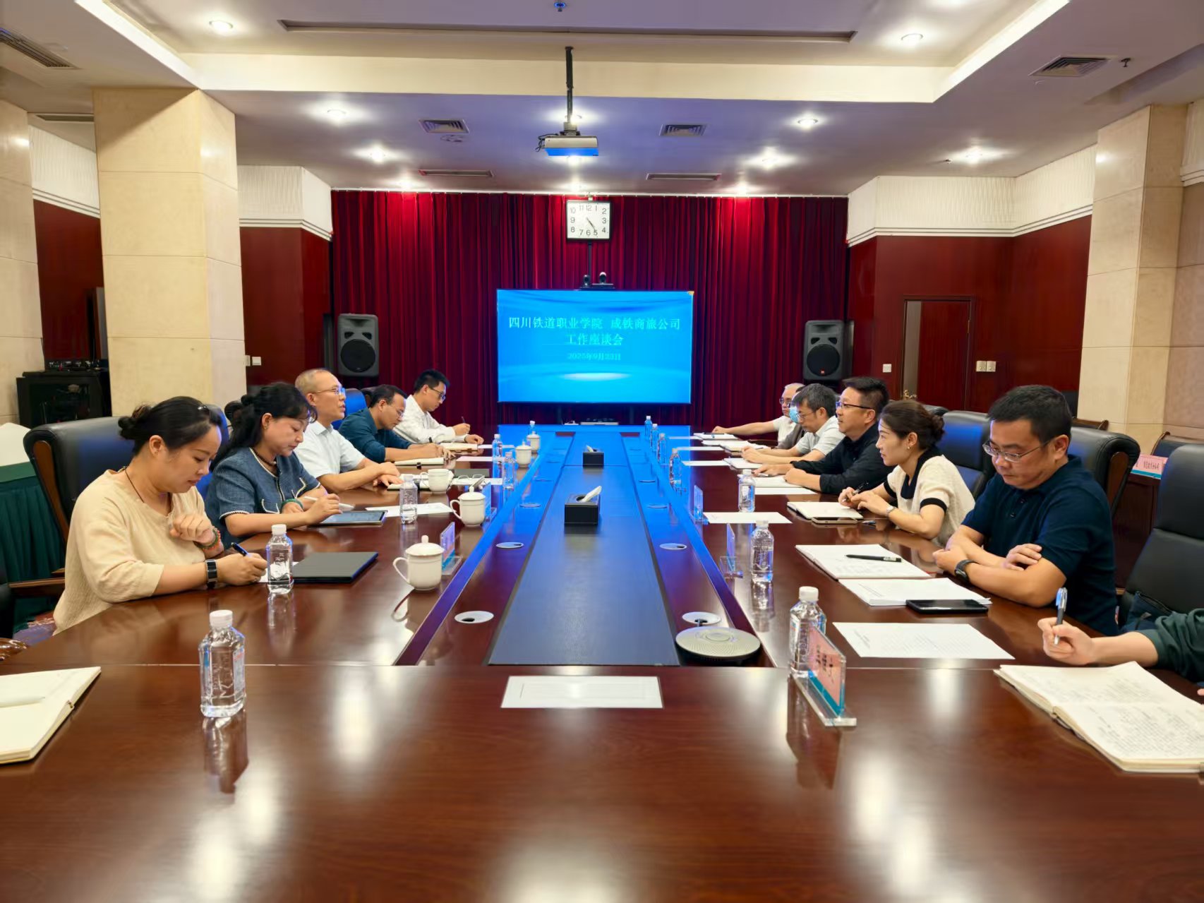 为加强校企合作、推进产教融合,9月23日上午,学校党委书记贺兆轩率队前往四川成都铁路国际商旅集团有限公司进行交流座谈。公司党委书记、董事长任泽毅,总经理邓鉴舸,以及人力资源部、旅游管理部等部门主要负责人参加了座谈。