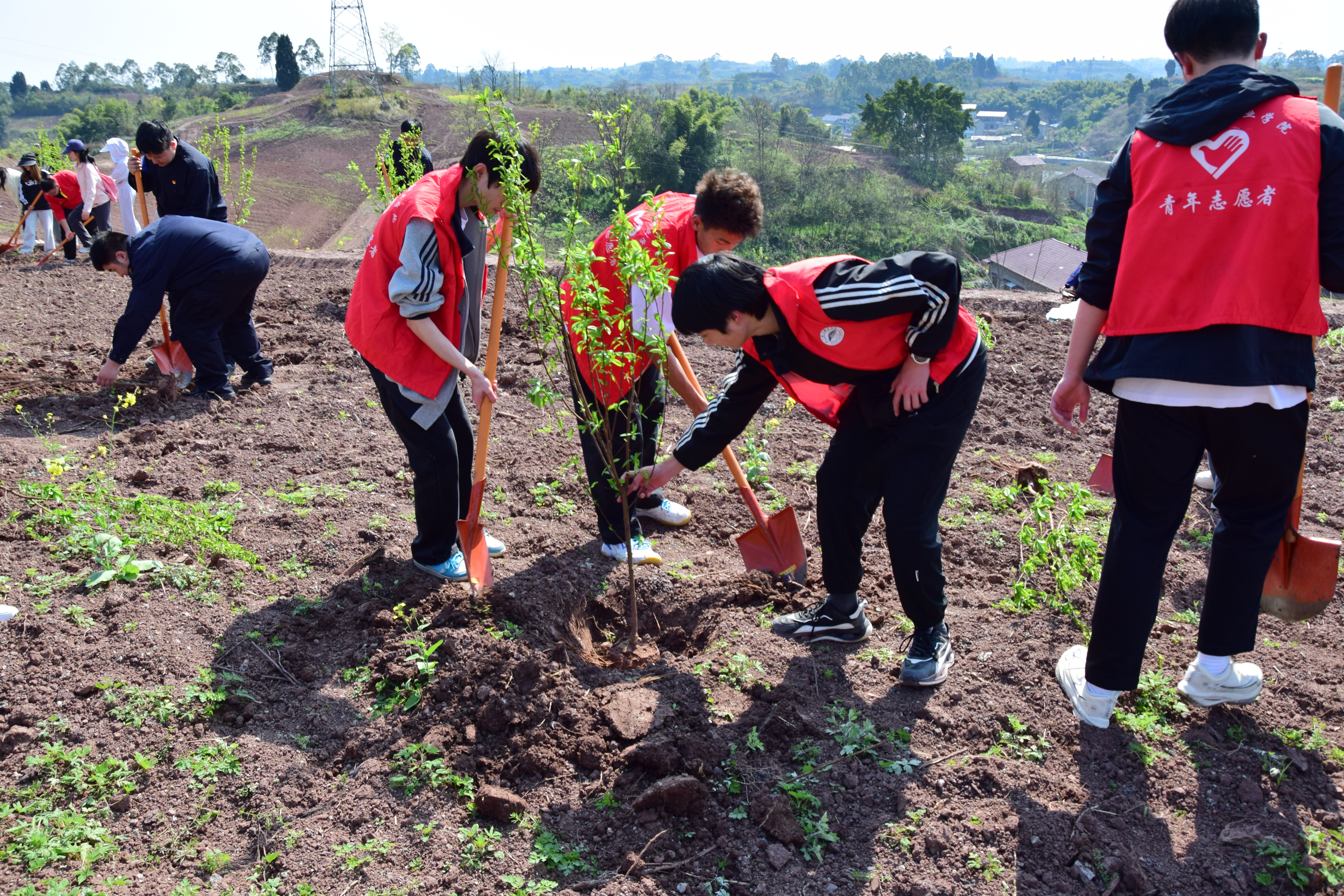 活动当天,阳光和煦,春风拂面。在校团委老师的带领下,学生们满怀热情地来到植树区域。现场人头攒动,一派热火朝天的劳动景象。