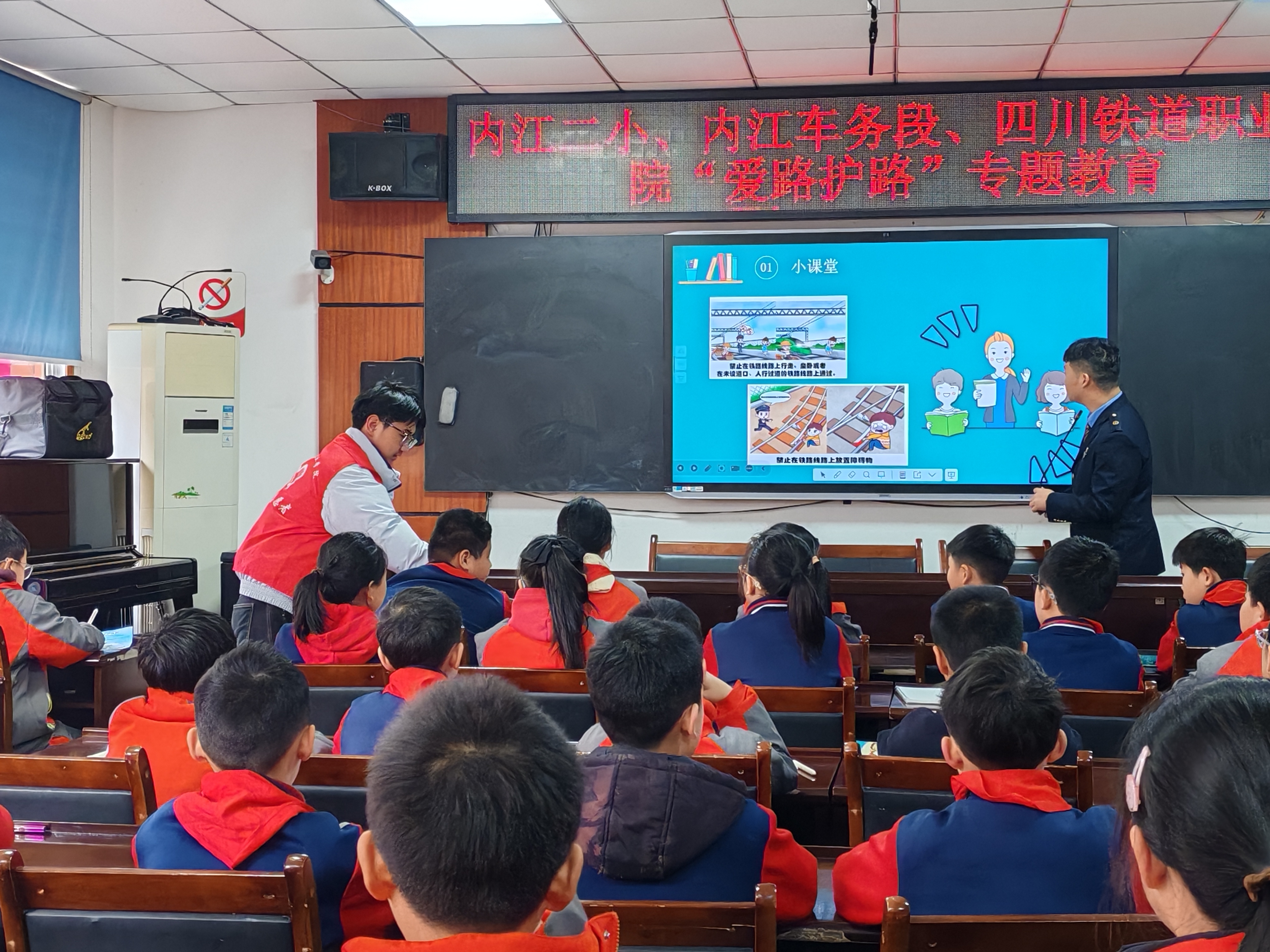 3月18日,我校携手内江车务段,走进内江市第二小学开展铁路安全教育专题活动。活动以“爱路护路”为核心,通过知识宣讲、资料发放、互动问答等形式,为孩子们带来了一堂生动实用的安全防护课。