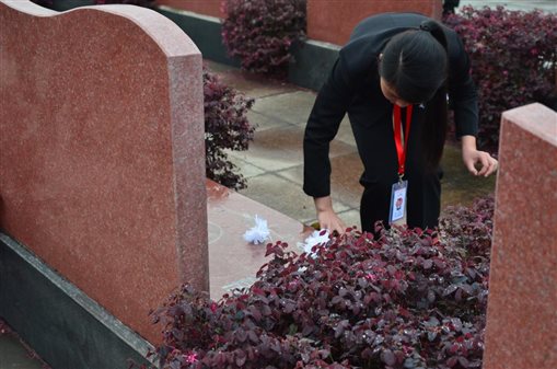 图三 同学们打扫墓碑,并为烈士们献上白花