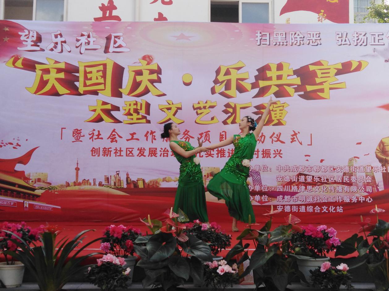 2018年9月28日上午,我院大学生艺术团学生受邀参加郫都区安德镇望乐社区“庆国庆·乐共享”大型文艺汇演暨社会工作服务项目启动仪式,本次活动由安德街道望乐社区两委主办、四川格律思文化传播有限公司承办。