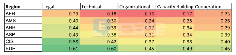GCI热图(注:绿色代表网络安全承诺中表现最佳,红色表现最差)