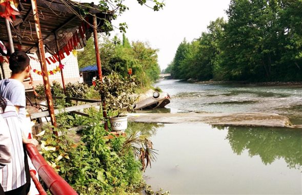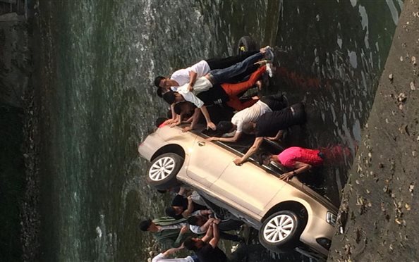 同学们在齐腰深的河水中合力施救的同时,周边热心的居民也已报警。车里有没有人,这是同学们最担心的,救援刻不容缓。但是该车车窗颜色较深,无法透过车窗判断车内是否有人。同学们先敲了几下车窗,然后对着车内大声喊道“小心,我们要砸窗了!”在多次用鹅卵石破窗未果的情况下,同学们到周边农户家借来工具砸。由于用力过猛,砸车窗的同学手被划破,但他并未在意,继续砸。车窗砸开后,立即探头进去查看车内是否有人,所幸的是车内并没有人,同学们悬着的心这才落了下来。在确认车内无人员伤亡的情况下,同学们又齐力尝试把车身翻转过来。