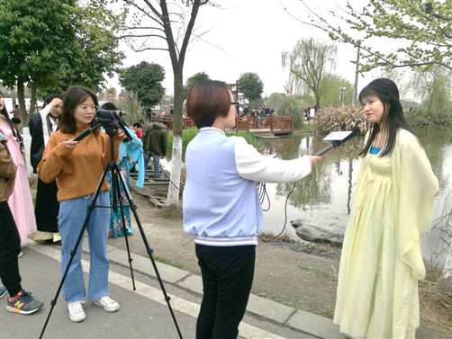 早上9:00,师生一行到达目的地,在主办方负责人的安排下,同学们身着汉服、展示汉文化,为游客提供咨询、引导服务和文明劝导。同学们的优质服务成为景区一道亮丽的风景,得到了游客的赞赏和主办方的高度认可。作为开幕式活动中的一大亮点,同学们还接受了四川日报、成都电视台等媒体的关注和采访。